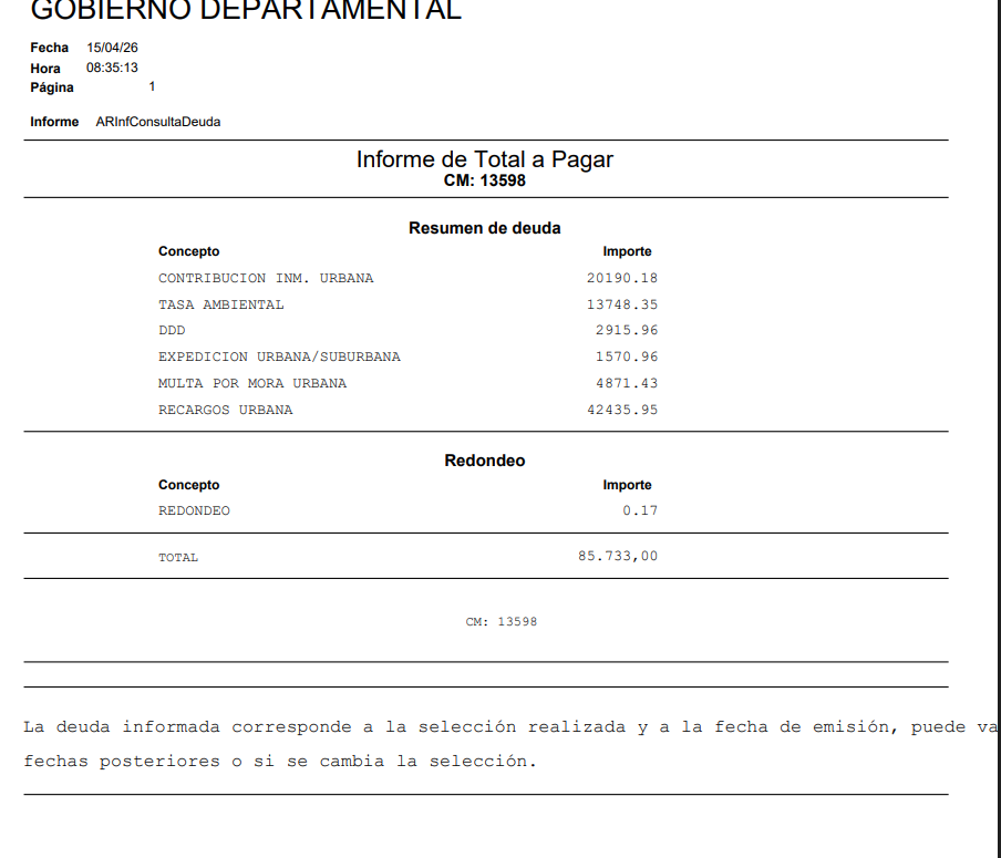 Deuda de Contribución $85.733 (CM 13598) Se debe desde la 3er cuota del año 2013 a la fecha.