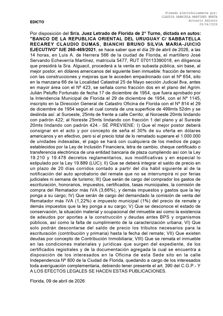 Es de cargo de los interesados asesorarse previamente al remate con su profesional de confianza a los efectos de consultar los antecedentes, titulación, y demás recaudos que estime oportuno, todo lo cual se encuentran a disposición en la oficina de la Sede en el el Juzgado Letrado de Florida de 2 Turno, sito en la calle Independencia Nº 800 ,Florida.-
